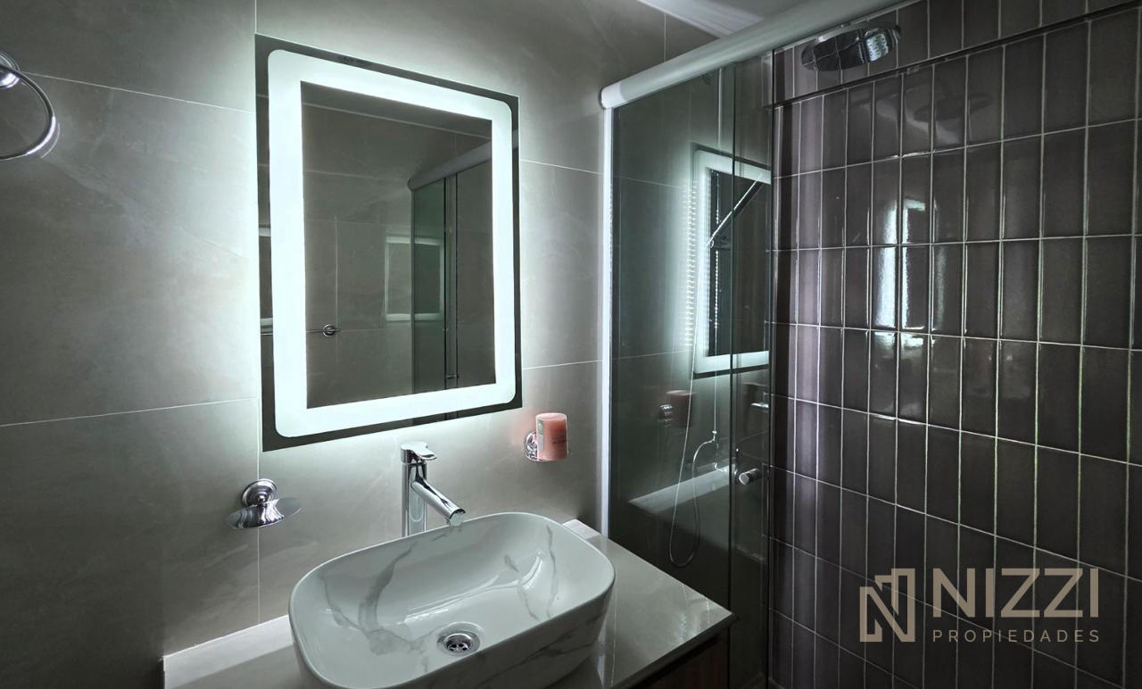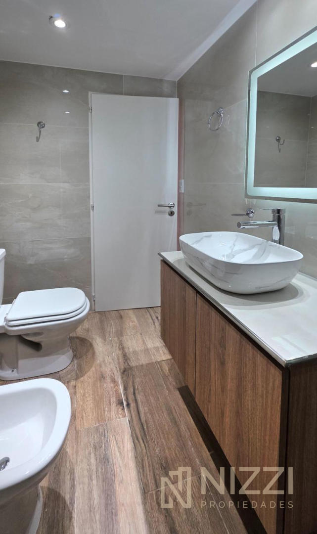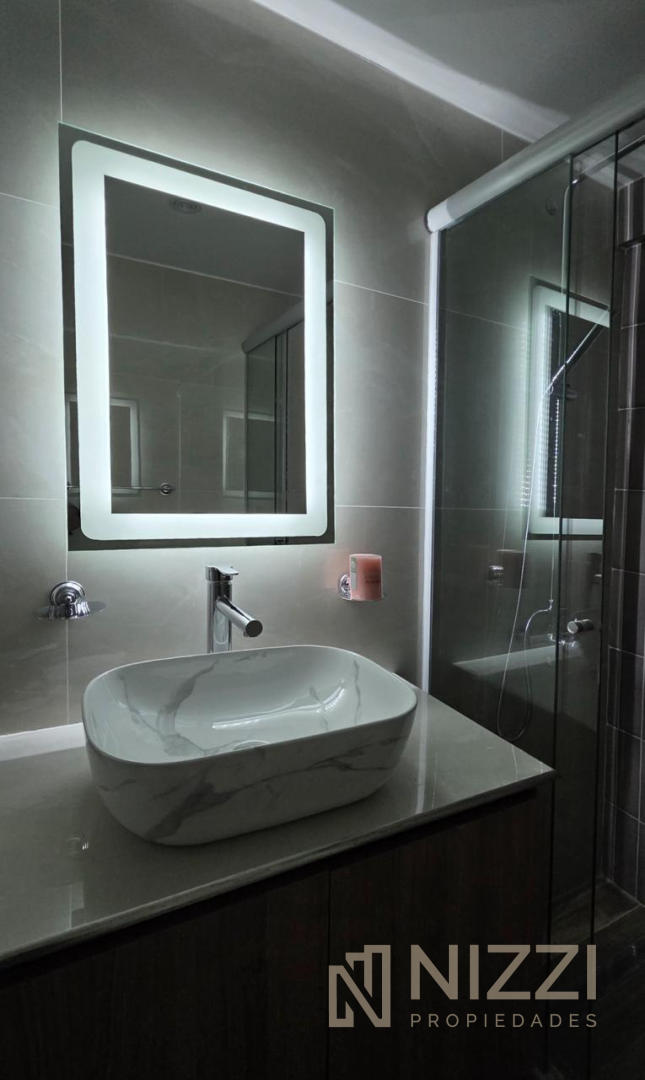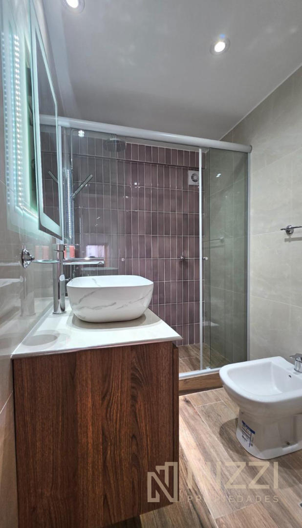 Baño completo con mampara, revestido en cerámicos y con sanitarios a estrenar