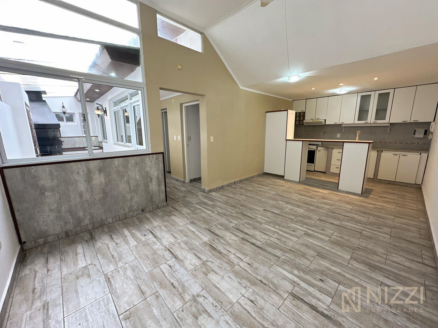 Amplio sector de estar comedor y cocina con barra y espacio bajo escalera
